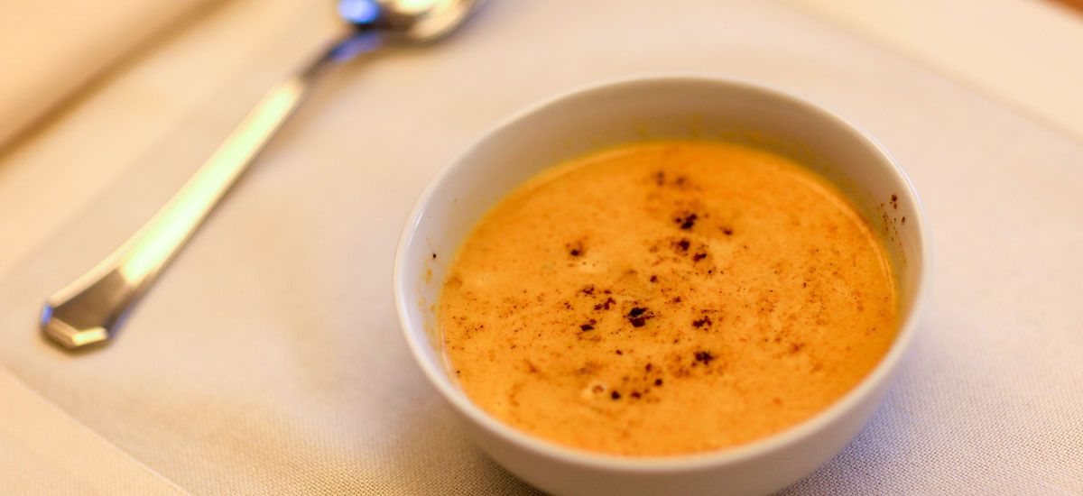 Möhren-Orangen-Suppe mit Garnelenspieß
