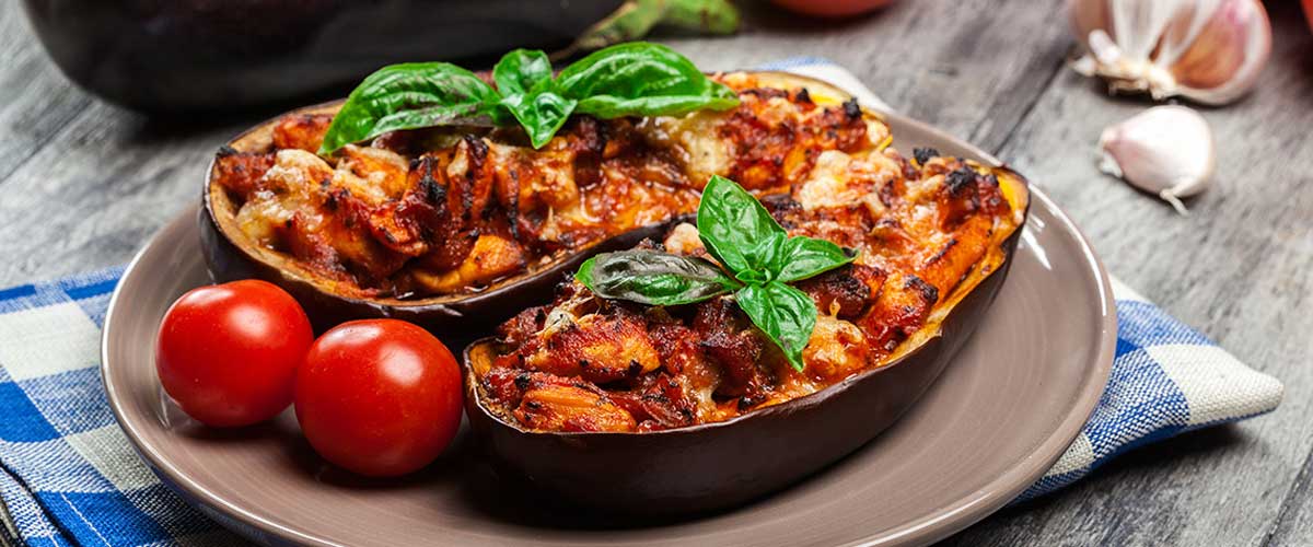 Die Aubergine ist vielseitig einsetzbar, sehr kalorienarm, aber immer lecker. In diese gefüllten Auberginen gehört unbedingt Zimt – so schmeckt es wirklich wie im Orient.